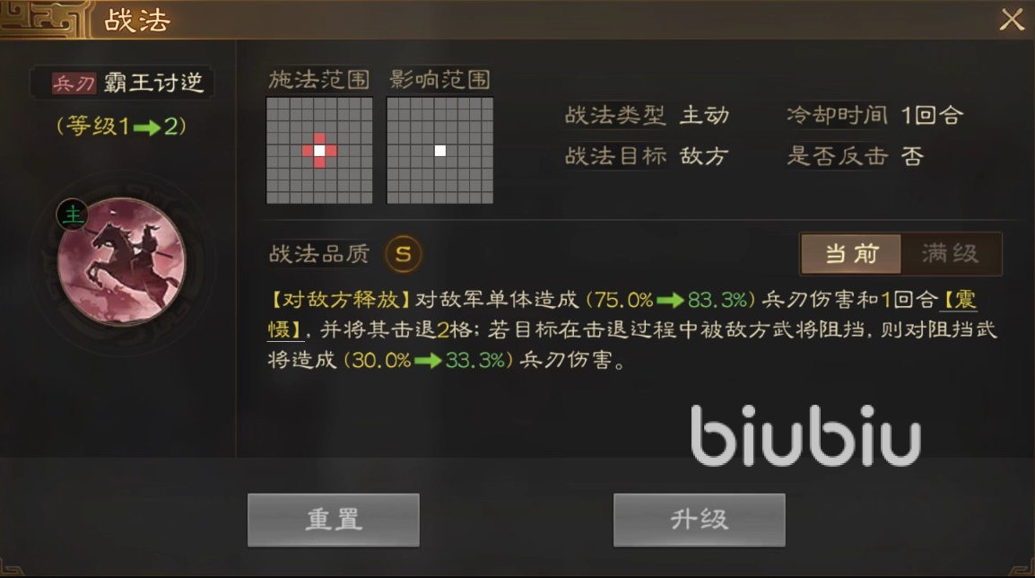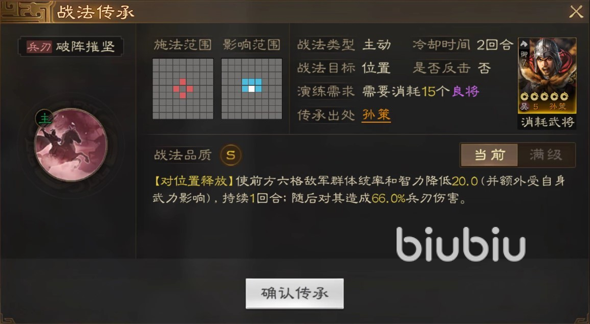 破阵摧坚施法范围和横扫千军完全相同,但是效果却变为了降低伤害目标身上的统率值和智力值,这两名属性影响的除了有谋略输出外,还有兵刃防御和谋略防御。降低了属性之后既削弱了输出,又提高了我方其他队友伤害,可谓是一举两得。随后附加的兵刃输出也极其可观,这样搭配起来孙策既有单体又有群伤。