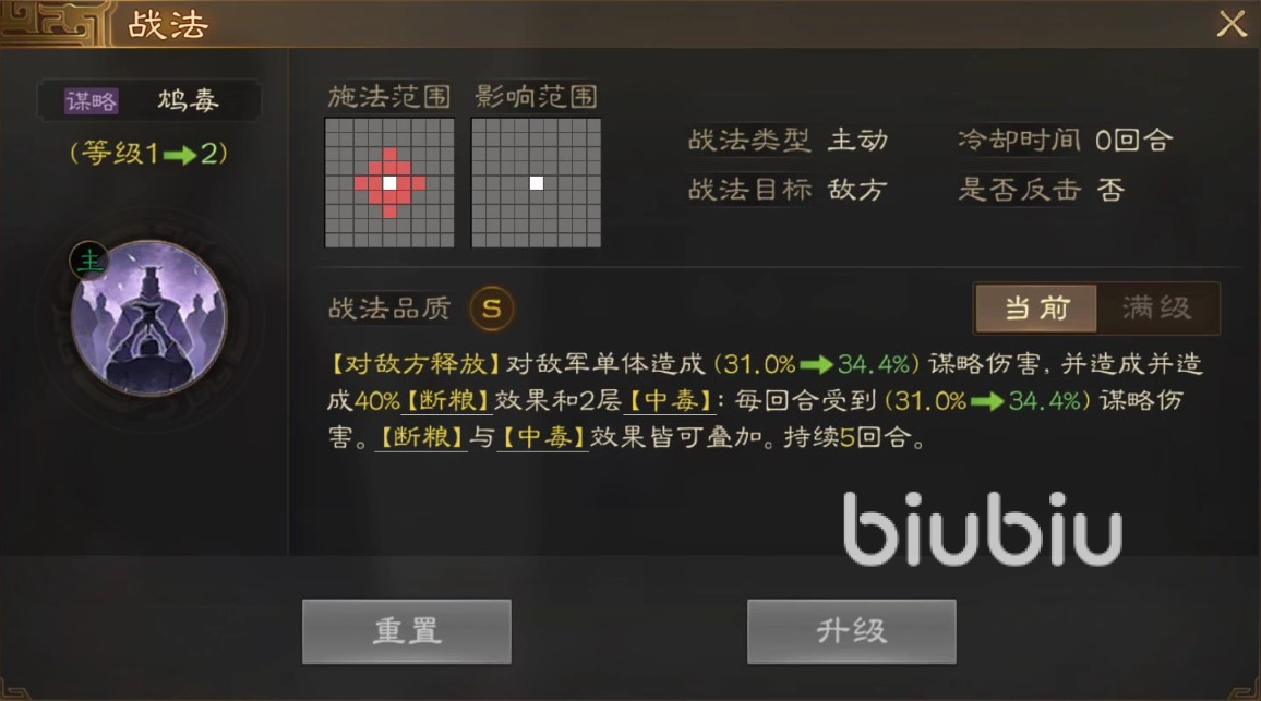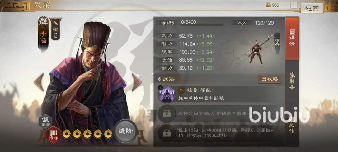 游戏中每一名武将最多携带三个不同战法,除了抽取到的时候自身携带的之外,另外两个可以自由组合搭配,这样就形成了非常个性的养成路线。对于李儒来说,自带战法效果非常丰富,既可以对敌方单体造成谋略伤害。还可以附加断粮和中毒效果,这两个都是游戏中非常有效的状态性技能,被断粮影响的目标接下来回复兵力降低,中毒则是持续回合内不断掉血,而且这两个效果效果可以叠加,也可以和其他队友技能一起生效。