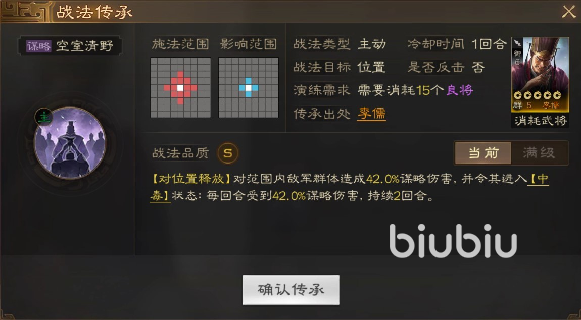 在不考虑其他阵容搭配情况下,小编建议是尽量让异常状态类限制更加丰富,同时中毒效果也要加强,这样即使没有其他队友帮助自己也可以叠加起来。所以推荐的两个战法搭配组合为空室清野和挟魂夺魄。其中空室清野为自身传承之后所获取技能,虽然效果上非常贴合,不过需要多抽取几张卡牌后才能获取到。效果是对指定范围内敌军进行伤害,并且附加中毒效果,这样两个技能中毒可以相互叠加起来,单单是持续伤害就已经非常可观。