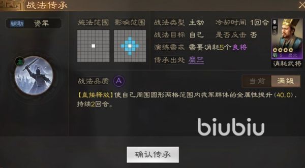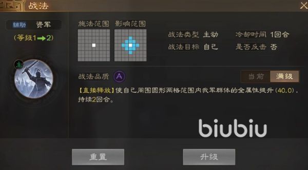 他的战法名为资军,佩戴后可以使队伍的全部属性都得到提升,当角色在正常的时候,可以让角色周边两格以内的全部队友的各项属性都提升40,并且该效果将会持续两个回合,他是一个主动技能,需要玩家自己点击使用,而且他有一个回合的冷却时间,使用完之后将需要停止一回合,才能再次使用,但是使用完这个技能之后并不会受到敌人的反击。