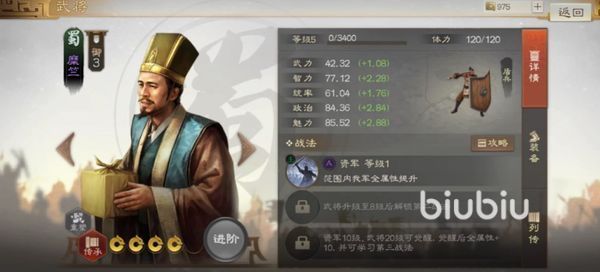 在这个游戏中,他是一个四星的紫将角色,所以总体来说他的强度并不是特别高,但是若作为内政官的话,他将可以发挥出比较不错的水平,但是在前期的时候,手上的角色不多,大家也是可以将他作为上阵的武将使用,他的战法上属于辅助型的。