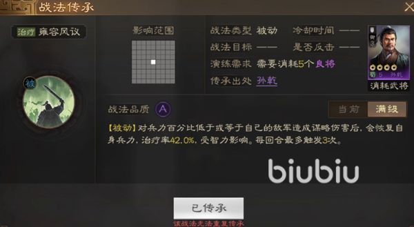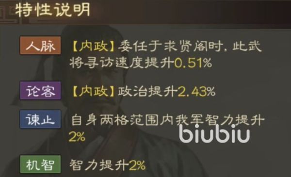 这个技能在恢复的治疗率上,大概是在42%左右,每一个回合还能最多触发三次,它是一个被动技能。而在自身特性上,可以看出这个角色也主要在内政上更有发展前途。