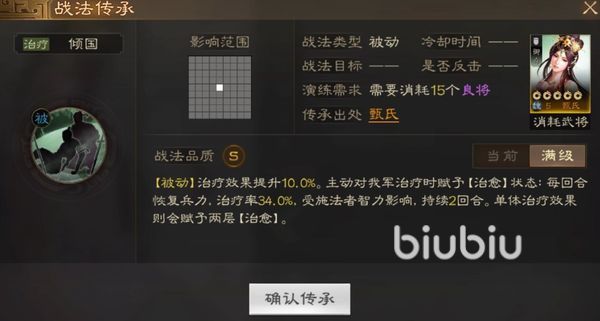 除了这个技能之外,还可以再带上一个倾国,也是将她的治疗量提高的一个技能,治疗效果会提高10%,并且还会给队友增加一个治愈效果,对单体治疗的话,该效果还能叠加两层。