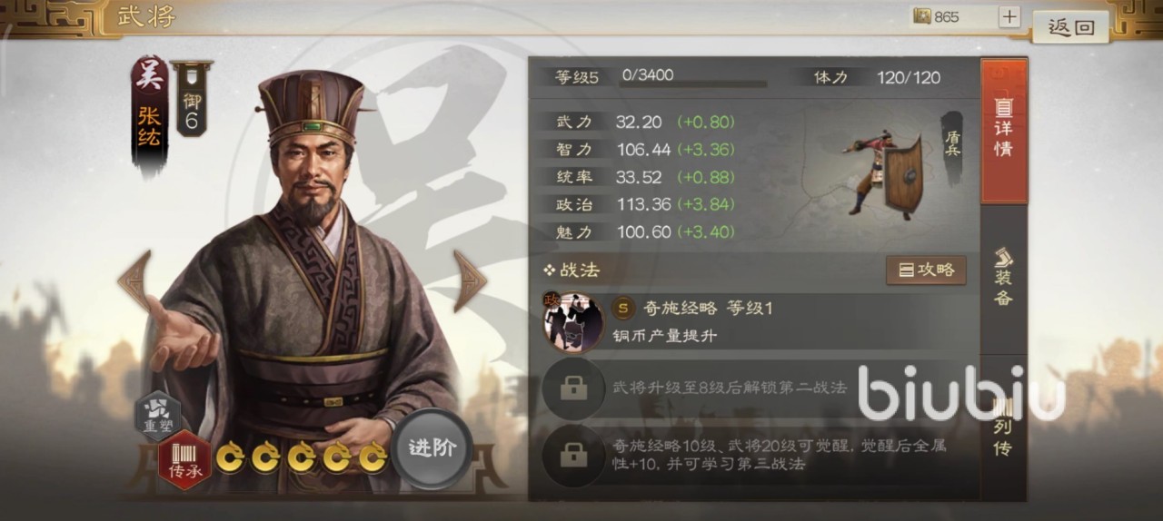 铜钱多了事情就好办了,游戏中许多资源的获取都需要用到钱,所以张纮虽然各方面属性都不错,但功能却比较单一,作为主政官提供铜币产量是他的最大职能。然后就是他的传承战法给到一些谋略输出类的智将,还是能有所发挥的。