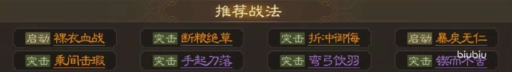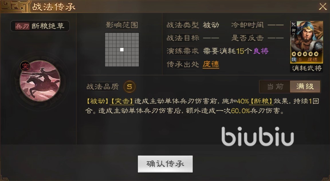 此外还可以搭配自己的传承战法“断绝粮草”,主动单体兵刃伤害,可以施加断粮的效果,也是非常契合庞德自己。当然如果你没有抽到第2个庞德,也可以用紫色的“手起刀落”,也是比较有用的战法,新手可以拆下来留着。