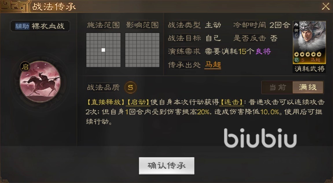 比如说“裸衣血战”这个传承自马超的战法也很适合庞德,可以普攻连续攻击2次,并且攻击之后还能再动。负面效果是自己受到的伤害提高20%,并且造成的伤害爱你各地10%,不过这对于庞德来说并不算负面效果,正瞅着要怎么耗血来触发特性的伤害加成呢!