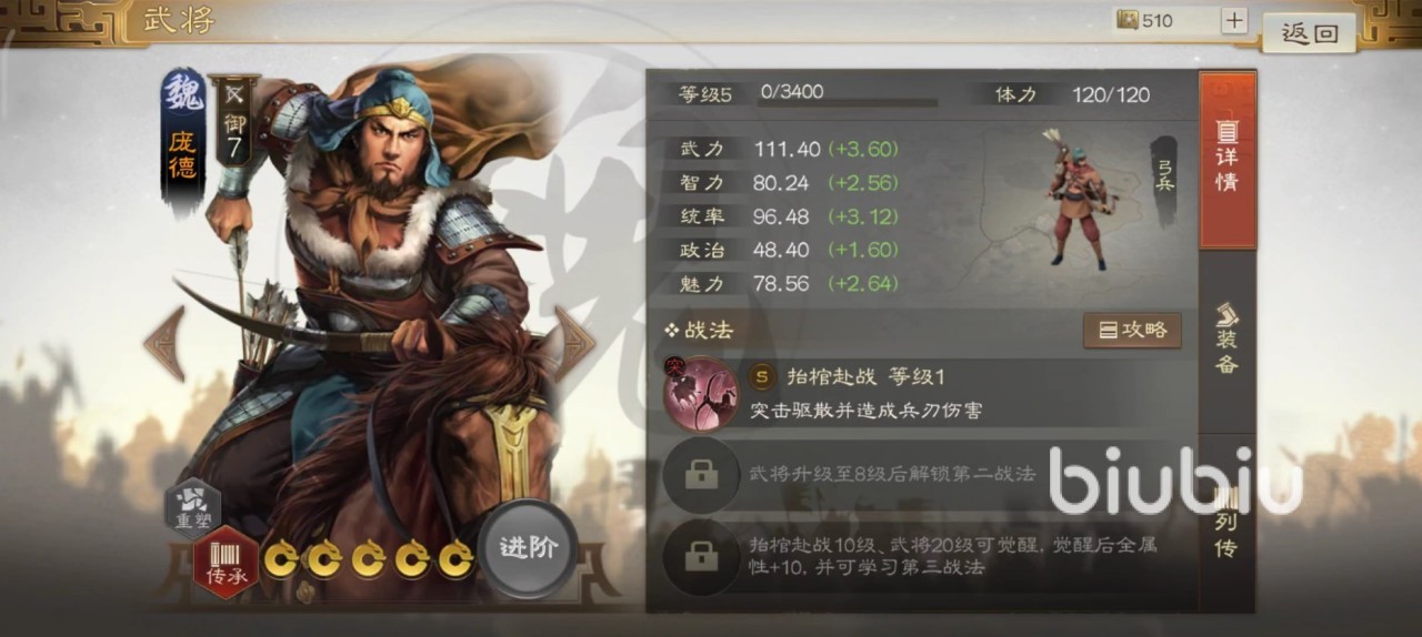 庞德“武德充沛”,武力值极高,统率值在弓兵武将中也是蛮高的了。自带战法是被动技能,使用突击类主动单体技能对敌人造成兵刃伤害之前会先驱散目标2个随机增益。