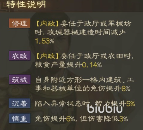 除了兵营玩家将贾逵为人道军械坊也能够减少建筑制造设备的时间,特性来看贾逵还有助于农耕粮食产量的提升,因此玩家们把握好这一点可以让城内的资源翻一番。自然而然建筑这方面也逃不了贾逵的掌控,玩家委任贾逵可以给当前城内正在建造的建筑提升8%的免伤能力。