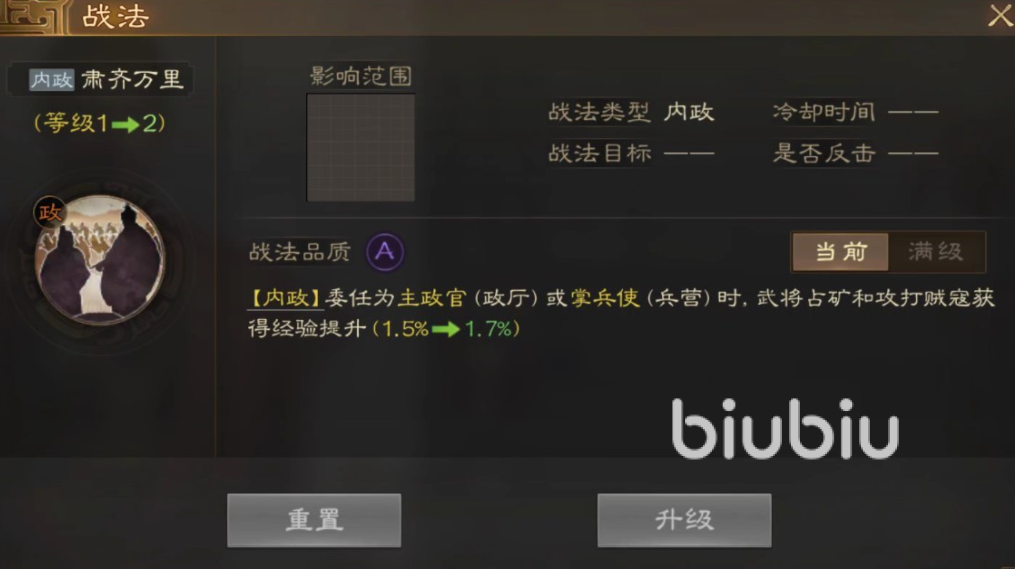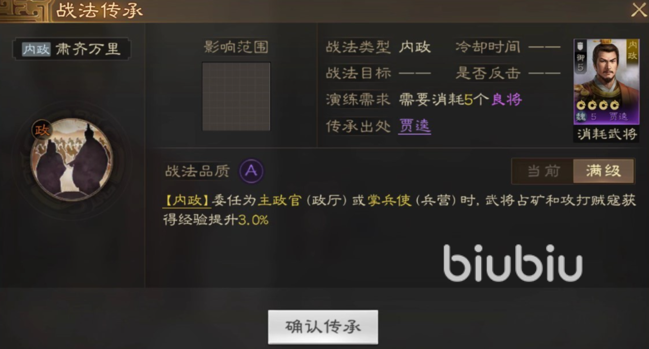 战法来看贾逵的战法作用于内政,玩家将贾逵委任到兵营之后再开发和战斗只要用的上军营的地方经验都会获得显著的提升。