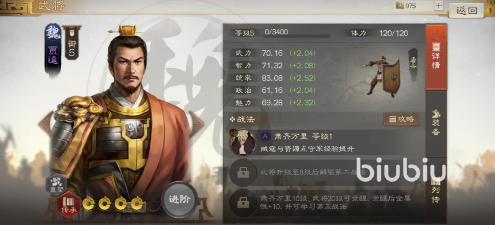 贾逵,魏国将领在游戏当中的兵种分类为盾兵,看得出来防御力非常不错。五项属性非常的平均,统率数值达到了五项最高,那么说明了贾逵这个角色适合带病打仗,并且智力武力持平,彰显了贾逵能文能武的存在。