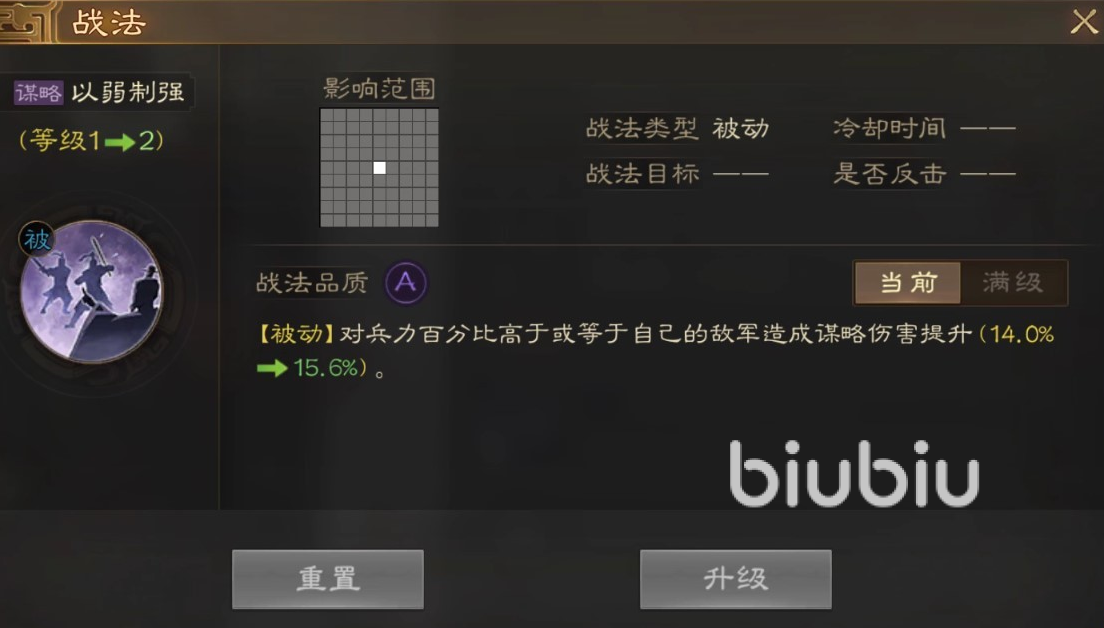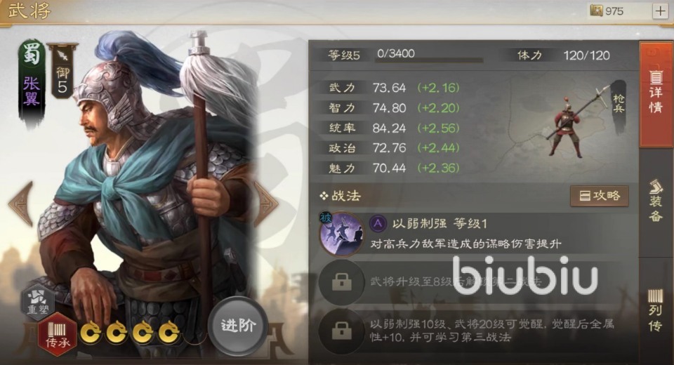 张翼在蜀国属于一个小将军,虽然实力比不上张飞、赵云,但是在战场上也是一个所向披靡的人物,作为一个四星紫将,他的基础属性有些低, 但是在前期对战中只要合理运用战法,也是能弥补这一缺点,他的战法是被动效果,为以弱制强,顾名思义就是当对手比自己强大的时候,那么张翼的整体输出能力将得到提升,这就是所谓的遇强则强。
