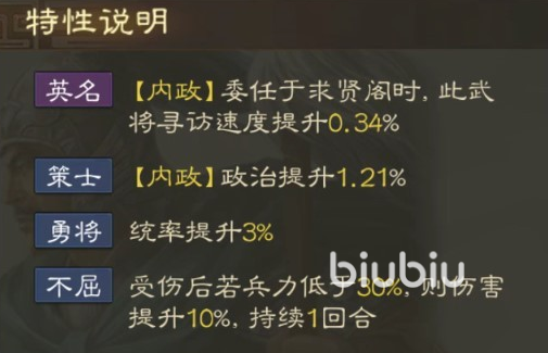 这个武将在游戏内的定位就是输出,可以作为任意队伍的输出平替使用,尤其是对于各位新手来说,前期没有那么多厉害的武将,这个武将能帮助我们度过难熬的新手期,无论是在战场上还是内政中,他都可以使用,所谓文武双全,如果将其应用在内政中,可以提升政治1.21%,将其委任于求贤阁则会提升我们武将的寻访速度,与其他文臣武将可以任意搭配。