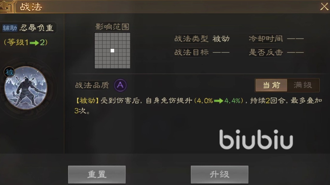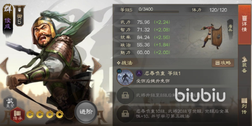 从基础属性上来看的话,这个角色的属性其实并不怎么样,他的统率能力有84,其他属性值的话,武力和智力在70以上,剩下的都在60以下,这即便是在四星级武将中也属于一个中等偏下的水平了,他拥有辅助的战法能力,是一个被动的效果,为忍辱负重,在受到伤害时可以提升自身免伤效果,持续时间为两回合,最多可以叠加三次。
