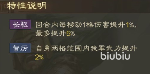 他的战斗特性也是为了帮助队伍输出而存在的,拥有长驱和督厉两种特性,长驱的话可以在回合内移动格子提高我们的伤害,最多可以提升5%,而督厉的话,则是在自身两个格子范围内,我军武力值提升2%,属于一个辅助型的特性,能够帮助队伍快速的进行输出,他没有同队加成的效果,这也就意味着在任何队伍中他都可以取代辅助进行使用,不过仅限于四星武将阵容,如果是在五星阵容中这个角色用起来其实是有些吃力的。