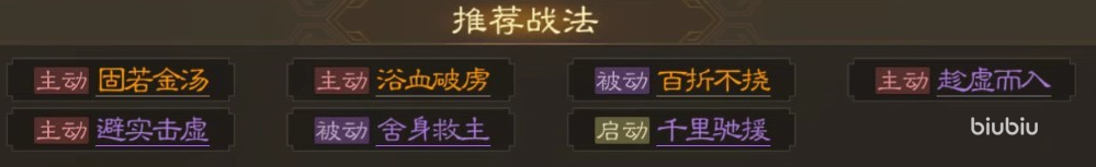 这个角色在阵容的搭配上主要就是选择那些强有力的输出武将,毕竟自身的输出效果不是很强势,只能搭配强有力的输出武将来弥补缺点。至于战法的搭配上,玩家们可以选择固若金汤、百折不挠等等,下面有详细的推荐战法,玩家们可以参考一下。