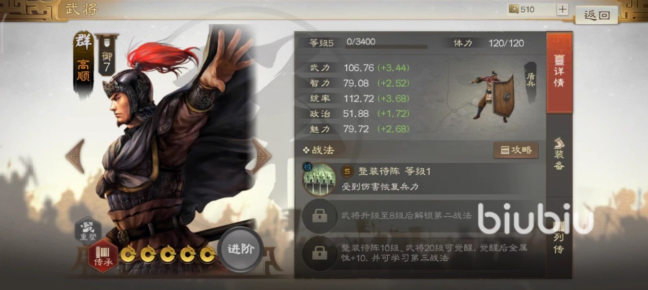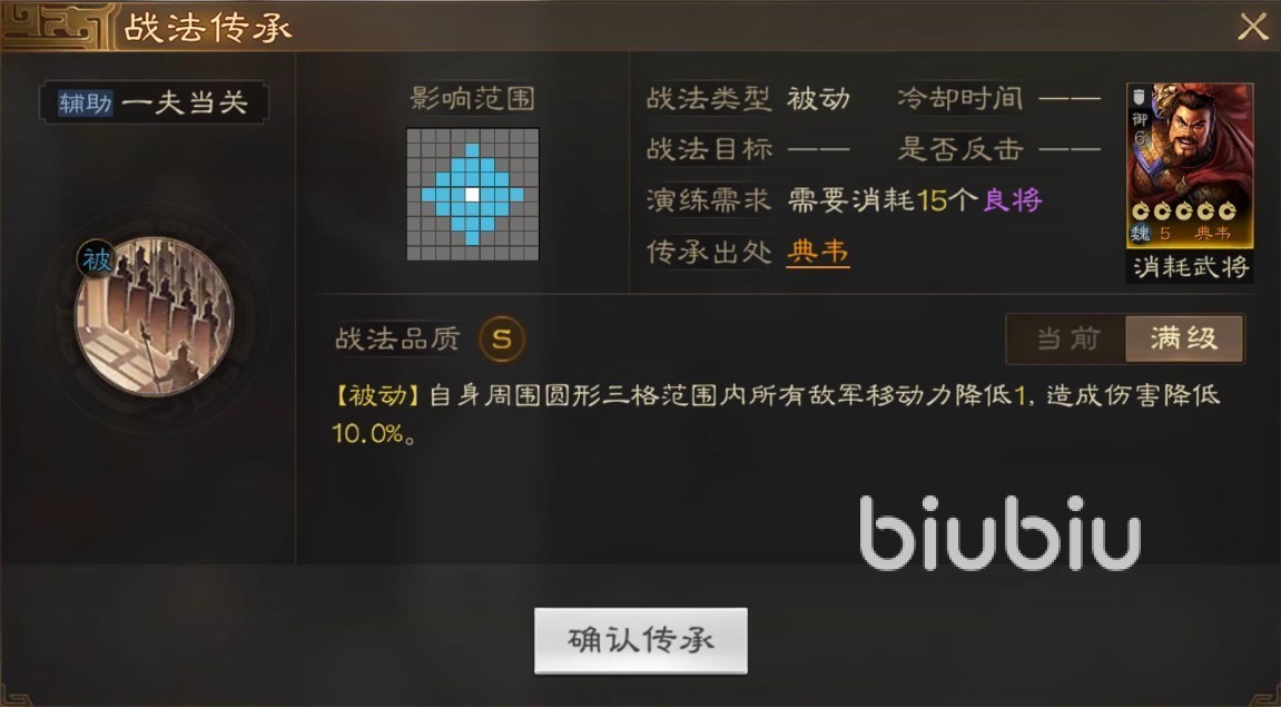 第3个战法推荐用“一夫当关”,典韦的传承战法,能降低周围敌人的移动力与造成的伤害,这样一来只要高顺在前面站着,敌人就难以冲过防线。如果觉得3个金色技能比较难入手,那么紫色“忍辱负重”也可以,只要是能提升坦度的就OK,有资源了再考虑换更好的。