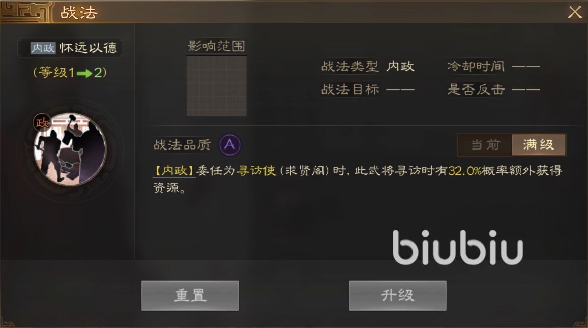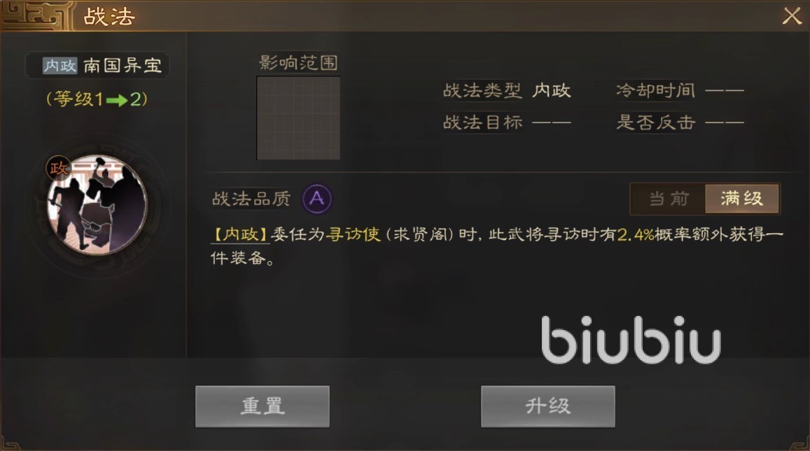 因此他的贡献主要是在内政这一块,搭配“南国异宝(传承自士燮)”、“怀远以德(传承自刘虞)”这两个战法,前者是在武将寻访的时候概率获得一件装备,可谓一举两得,后者则是在寻访的是概率获得额外资源。