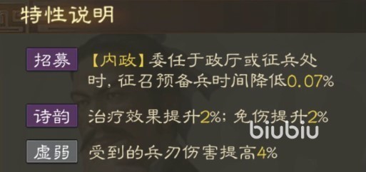 自带的战法“建安诗人”可以提升最高2.2%的寻访速度,特性能小幅降低预备兵征召时间。“诗韵”略微提高受治疗效果并且有小幅免伤提升,但“虚弱”的特性会额外受到4%的兵刃伤害,这使得他难以作为前排上战场。