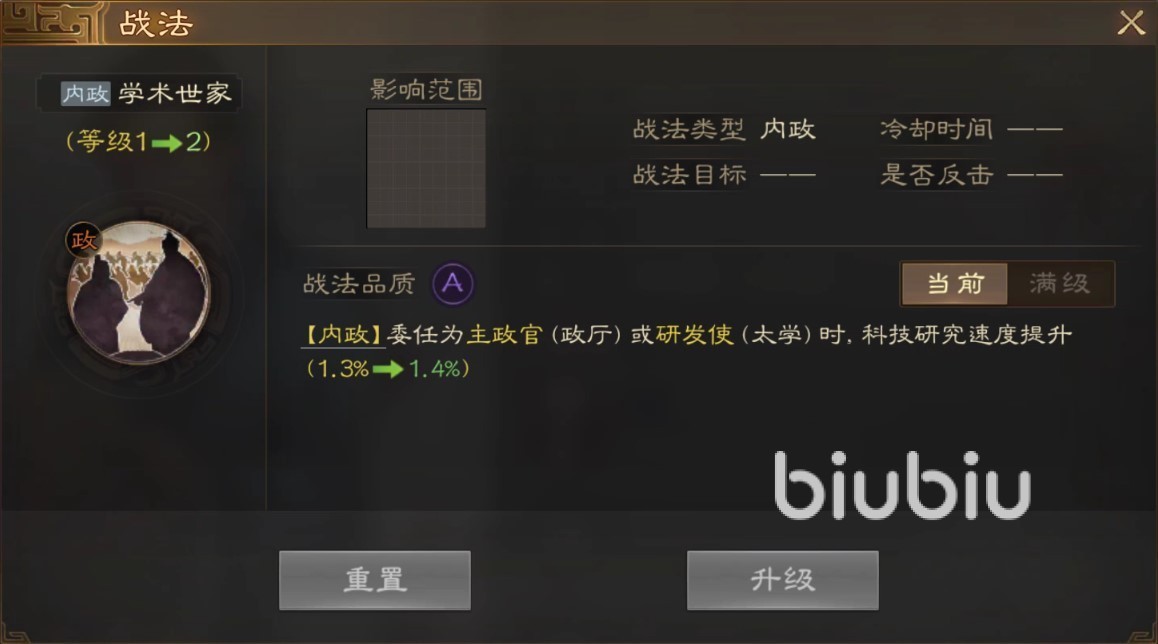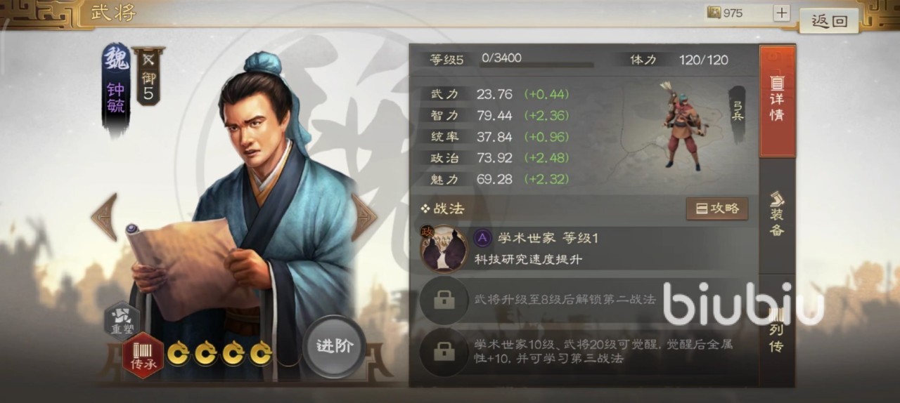 其武力成长甚至0.5都不到,所以用来作为武将是不太合格的,突出的属性是智力政治和魅力,所以作为管理主城的官员是没啥问题的,战法学术世家也侧面证明了这一点,技能的主要效果就是提高科技研究速度。