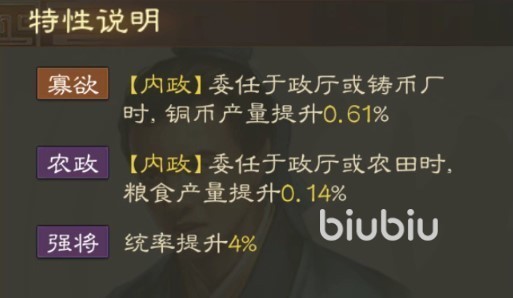 在特性方面,说明了钟毓在管理内政的能力上是没有多少问题的,提高铜币产量,提高粮食产量,基本在主城中几个设施都可以施展拳脚,提升一点点的统率反而没什么吸引力了。