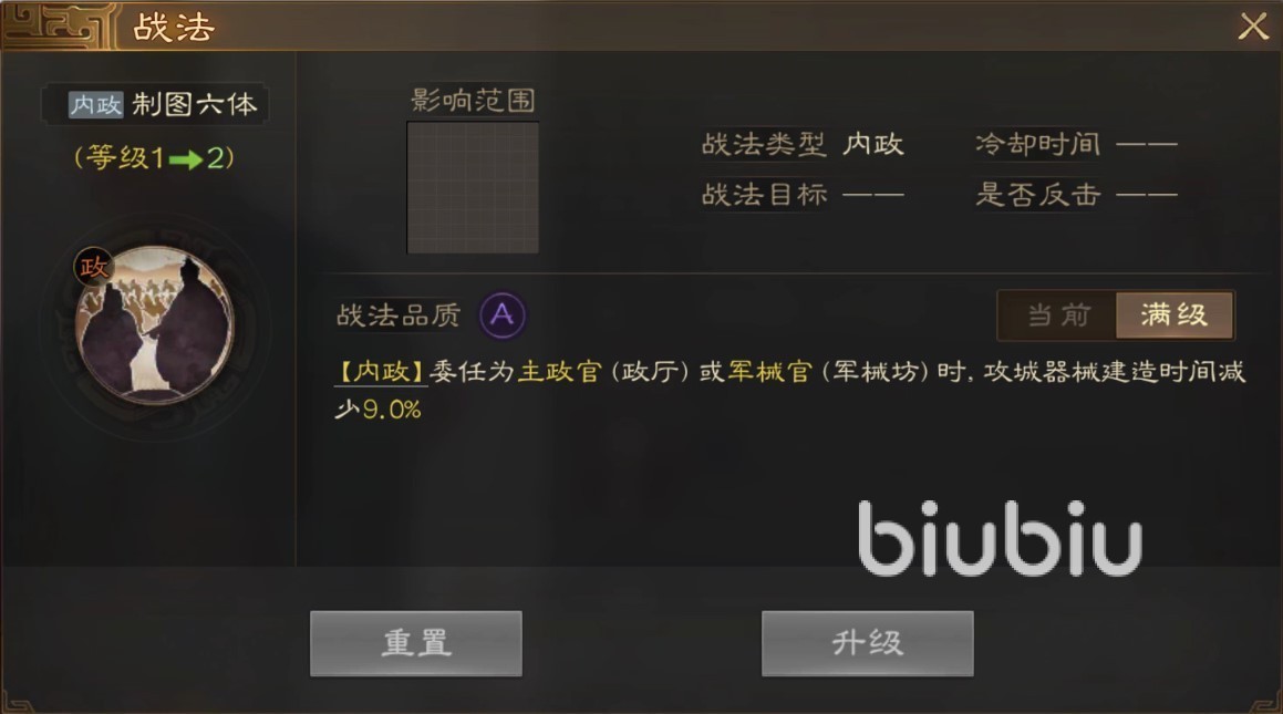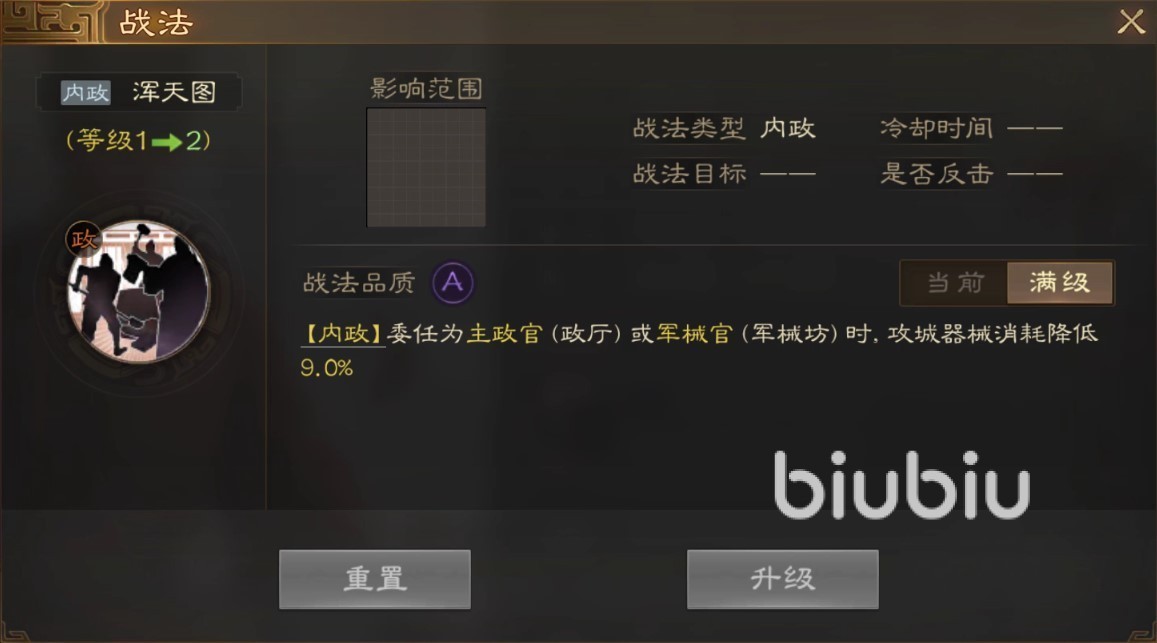 为了进一步在器械制造这一块能有所发挥,我们需要给他搭配另外2个战法,这里推荐“浑天图”,来自陆绩的技能,减少9%的器械消耗。两个技能放一起一个减时间一个减消耗,能够大大提升攻城类器械的生产效率,让你拥有更多攻城利器。