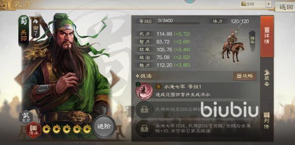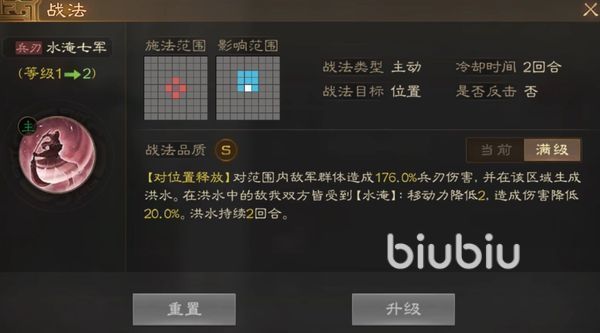 这个角色他的优点主要是在技能上面,他的战法水淹七军想必小伙伴们也不陌生,主要效果是直接对一个范围内制造洪水,并对里面的敌人造成水淹伤害,这个技能当他遇到敌人的时候,可以直接对多位敌人造成173%的兵刃伤害,而且他所攻击的那个区域,还会产生洪水效果,让敌人的移动速度受损,不过需要注意一下的是,由于这个洪水效果是不分敌人以及队友的,在该范围内的话,队友的移动力也是会受到一定影响的。