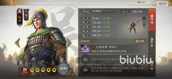 上面介绍过了,五星角色的强度比较高,而吴国的陆逊,他在所有角色中也是非常亮眼的一个武将,他的属性面板中的各项数值除了武力值,其他数值都在110左右,武力值也达到了80,在整个游戏中也是比较全能的一个角色了,综合方面来看,他也是一个非常不错的选择。若是他和t0在一个队伍的话,诸葛亮可以先使用破坏阵容的技能,将敌人全部集中在一起,然后进行输出,而他的话可以释放一个超高的爆发性伤害,直接对集中在一起的敌人进行收割,基本上游戏就结束了,他是游戏中的输出顶流,是所有武将中的输出最高点。