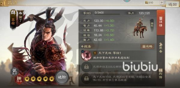 要说前面两个角色在武力值上面可能要稍微弱一点的话,那么吕布则是游戏中武力值最高的一个武将了,他的数值高达123,这也就是代表他在游戏中使用普攻的话,就能直接对敌人造成超高的伤害,甚至都无需技能进行补伤的,他的兵刃伤害也相当的高,在游戏内他的统率达到了113,可以对敌人造成超高的物理伤害,并且它自身还带有伤害加成以及免疫敌方控制技能的效果,若是敌方对他实施控制技能的话,他能直接免疫掉,并且使用技能进行反击,他是这个游戏中的武力值巅峰。