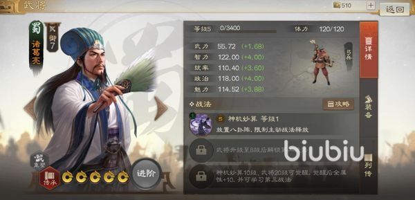 他在游戏中是一个五星大将,在游戏武将的设定中,有四星大将、五星大将,星级的不同,在某种意义上他们的强度也是不一样的,四星的强度要比五星的弱很多,而他又是五星里面最好的一个角色,再加上他本身的强度,因此才排在了这个位置。他的智力非常的高,达到了122,除了智力以外,其他的各项数值都比较不错,除了武力值稍微弱一点之外,其他数值都在110以上,是一个非常厉害的武将。他有着超高的范围内法术伤害,可以使用这个角色让敌方的阵容顺序改变,打乱敌方战斗节奏,并让他们全部聚集在一起,然后使用法术攻击敌方群体,就可以对他们直接造成超高的伤害,还有几率触发技能加成效果,要是稍微脆一点的角色,根本就扛不住这一套,而且他破坏阵型的技能是所有武将中的唯一一个,在战斗中用处非常大。