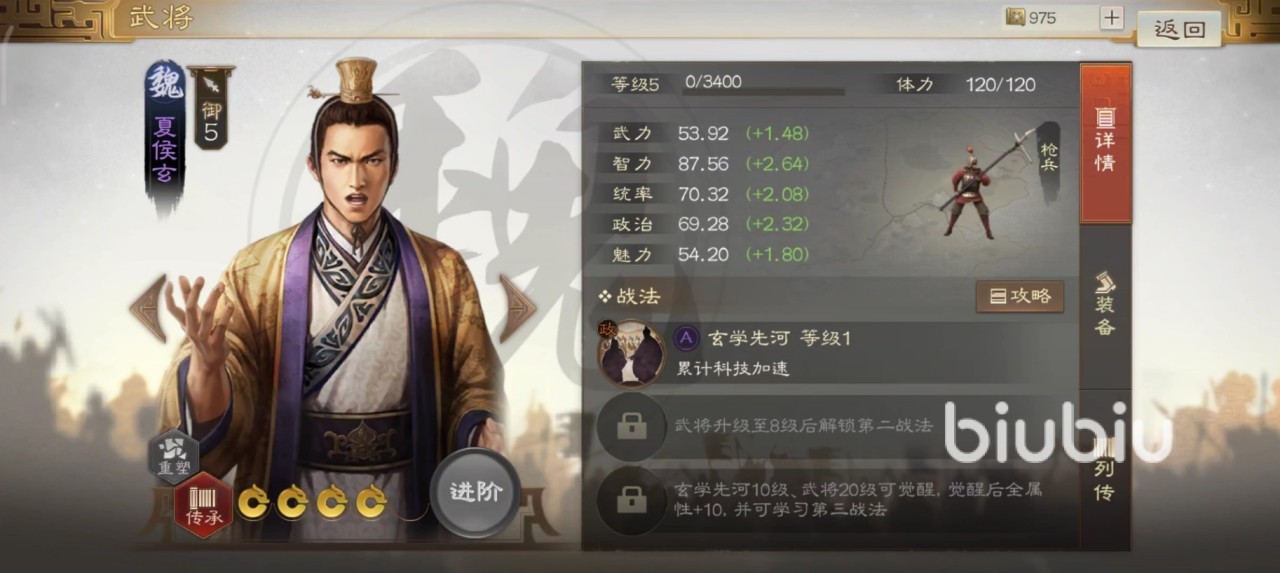 因为自身是枪兵,所以在前期的战斗中可以作为近战常规输出部队来攻略主线等难度较低的内容,后面队伍强度上来后,就得换成更高品级的战斗型武将了,毕竟在战法上,夏侯玄就不是那种适合战斗的类型。