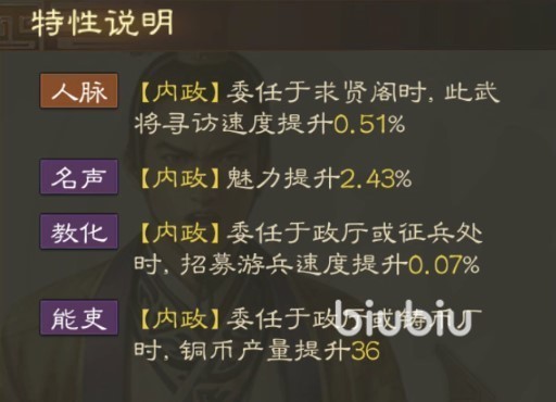 夏侯玄的特性全部都是内政加成,分别对武将寻访速度,招募游兵速度以及铜币产量都有提升,这些提高让夏侯玄在入驻政厅时有着最多的加成,所以放在政厅的话,他提供的收益在某种程度上来说就是五星级的。