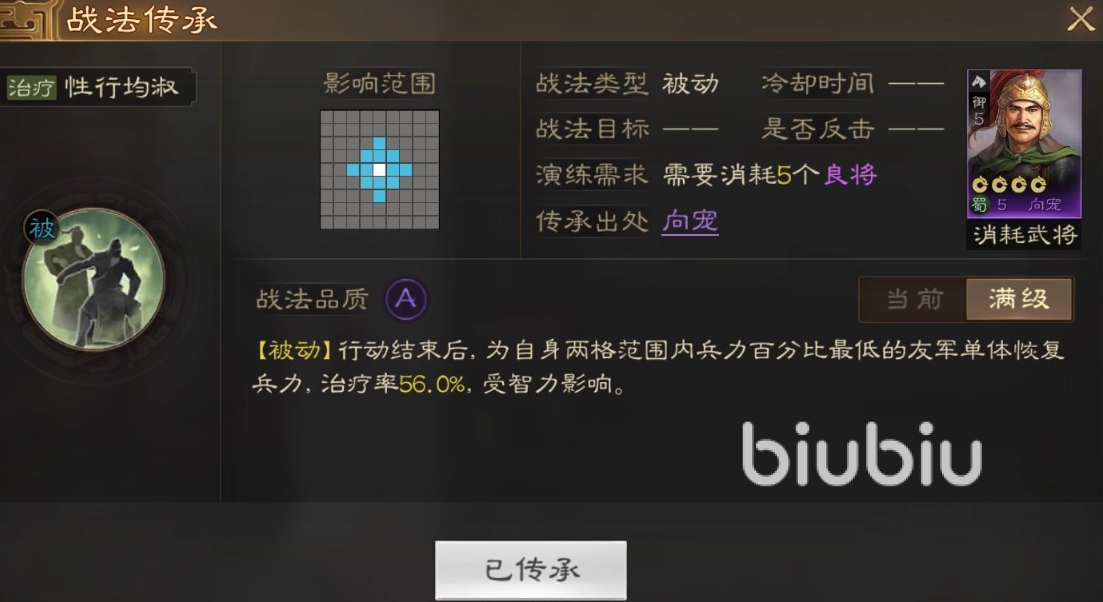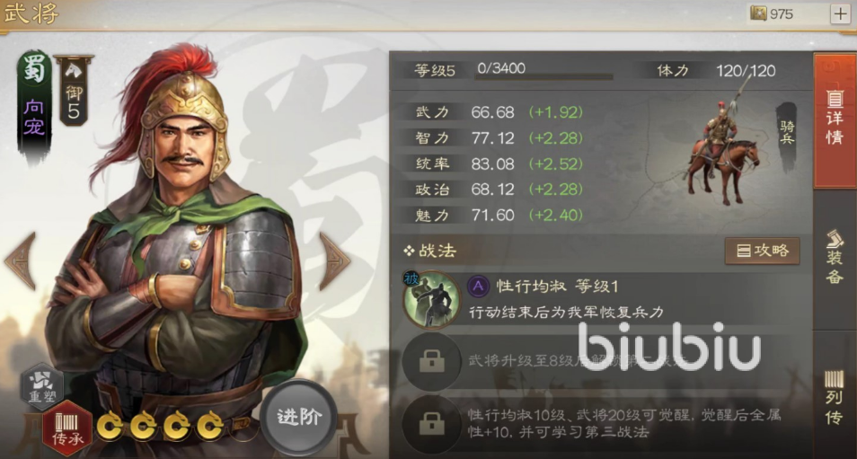 向宠虽然在游戏内的定位是骑兵,但是他主要的作用还是帮助队伍恢复兵力,没有太多限制条件,操作非常简单,基础属性不高,处于一个比较偏低的水平,不过统率能力比较强,他的战法就是作为恢复使用的,属于被动战法,不需要主动释放,在每回合行动结束之后,可以为自身范围内两格子的兵力百分比最低的队友恢复一定的兵力值,恢复能力会随着武将的等级以及战法的等级提升而不断变化的,会受到智力的影响。