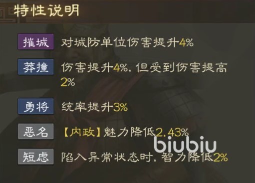 就史料来看,这个人物在当时并没有什么杰出的事迹,而他在游戏里的强度也没有太高。通过其属性面板可以知道,这个人是偏向于输出型角色,他的智力数值并不高。