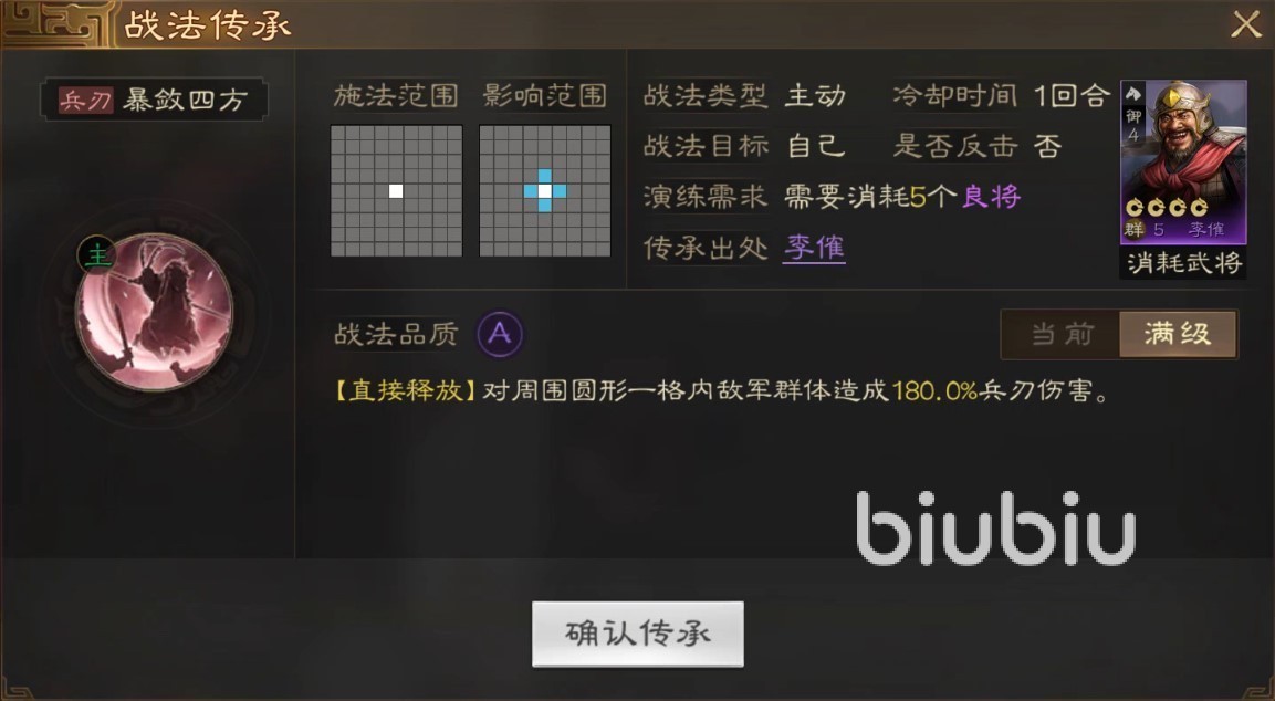 其中在初始等级的时候,这个技能的效果是可以对周围一格区域内的敌方人员造成伤害,这个伤害最高为百分百。而在这个技能满级的时候可以对敌方造成百分之一百八十的攻击值。此外他的传承战法和自带的能力是一样的。