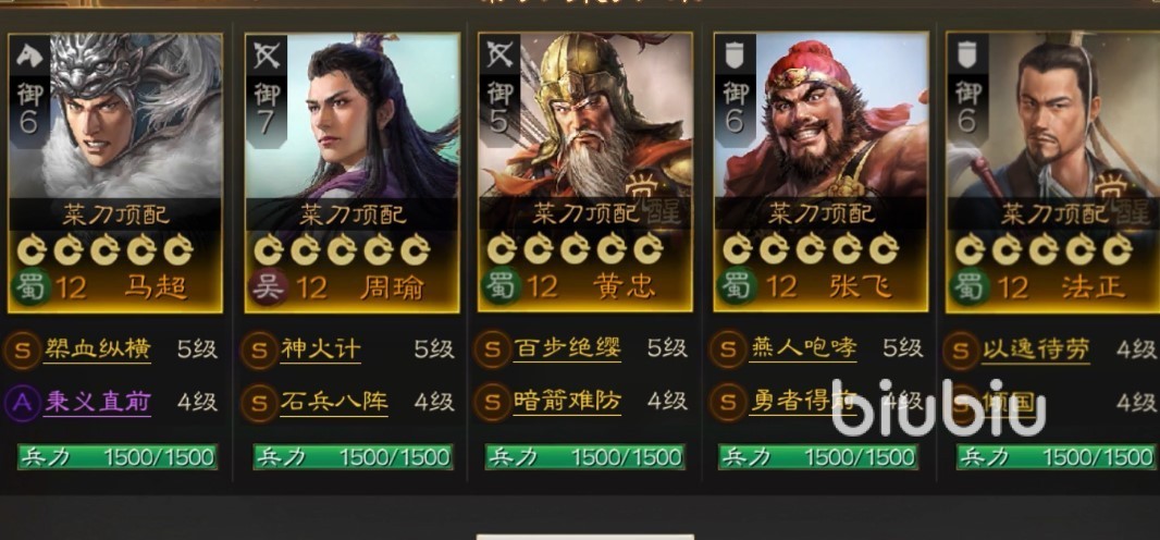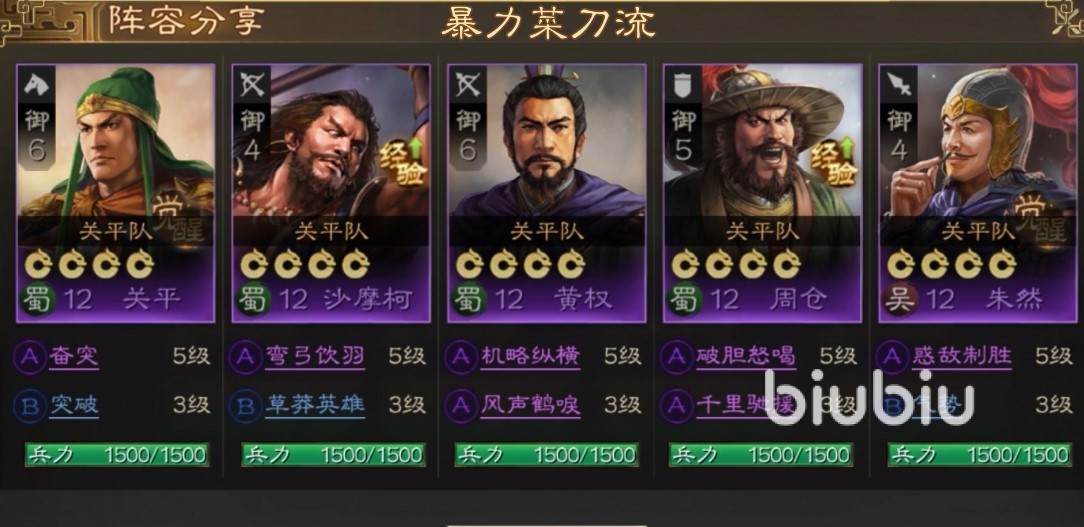 开荒队用得最多的就是菜刀流,全队5个都是输出,推荐关平、黄权、沙摩柯、周仓、朱然,这套阵容对配置的需求不高,合计下来只要25点的统御值,主城到了3级就能满配,不必担心御值不够导致无法使用。战法这块关平带“突破”,能对攻击目标左右两侧造成伤害,群伤明显。黄权带“风声鹤唳”范围谋略伤害,沙摩柯带“草莽英雄”,伤害外加减防减智。周仓带“千里驰援”,给队友挡伤害,有再动和提高统率值的效果。朱然携带“气势”降低周围敌军的防御,加起来技能有3蓝2紫,第一天获取并不难。如果有招到属性更好的武将,技能合适也可以直接替换,例如说关平可以用更好的马超来代替,黄泉换成周瑜,沙漠和换成黄忠或者严颜,周仓换成张飞,朱然用法正替代。即便没有橙卡,这些紫卡也是很好使的。