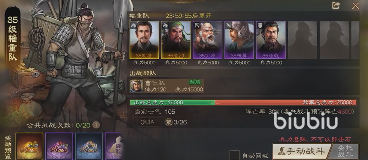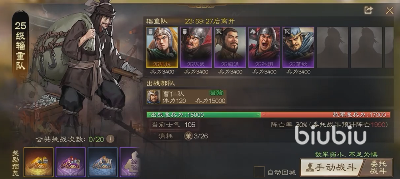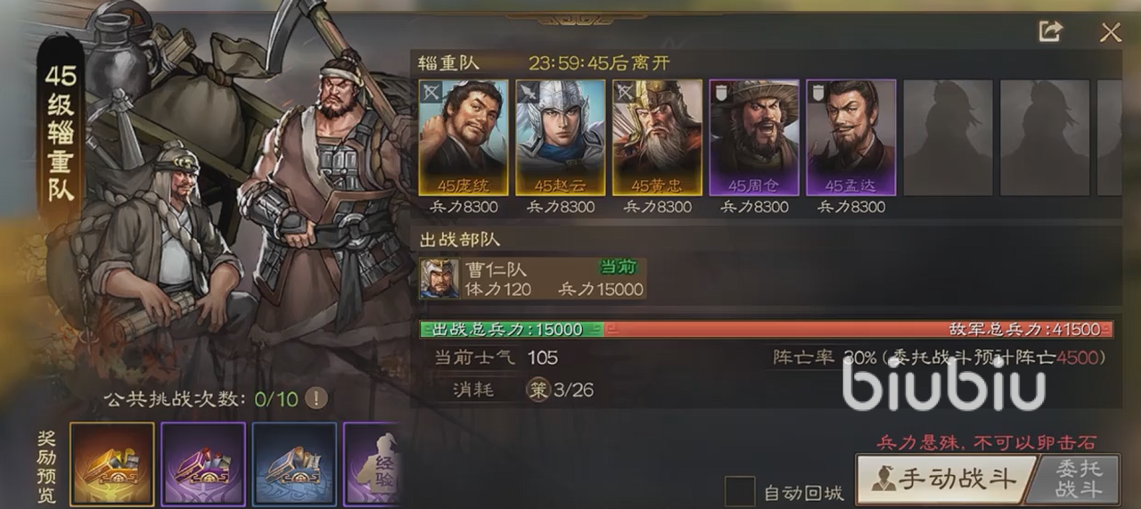 该队伍在地图上的刷新,是根据我们的霸业进度来进行逐渐解锁的,基本上我们只要解锁第二个,便可以开启讨伐辎重队的玩法。该队伍强度一般,最低25级,最高50级,而且它是根据我们的霸业进度不同,刷新的等级也会逐步增加。挑战该队伍需要消耗策书,每队会有一定的挑战次数,次数达到上限后便会消失。