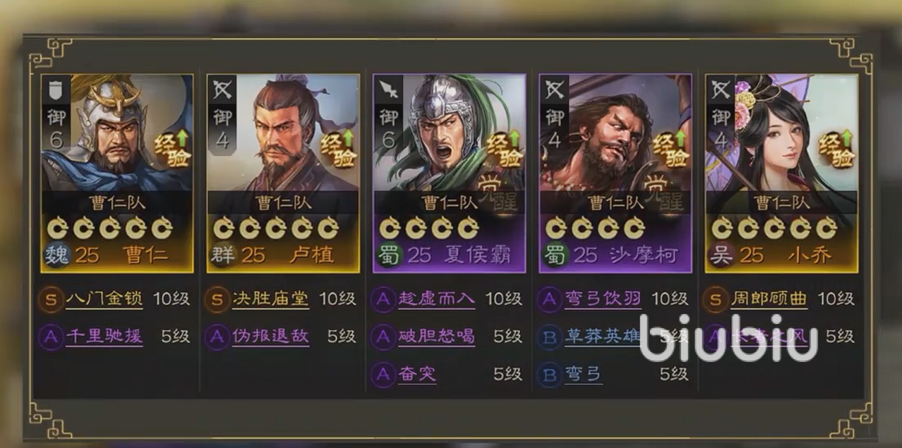当然,如果实在不知道该如何配对的话,本期给大家推荐一个曹仁领队的标准开荒队。队伍有曹仁、卢植、夏侯霸、小乔、沙摩柯组成。是标准的开荒阵容,绝大多数角色,都基本上可以靠游戏赠送获得,就连稀有度较高的小乔,也可以换一些其他类型的辅助角色。毕竟前期的辎重队都非常的弱,技能方面也不是很强,只要我们战法达到一定级别,基本上都可以很轻松的过关。