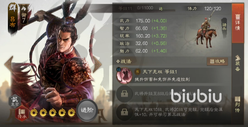 在本作游戏中,奉先的实力有着较为不错的体现,有着游戏中武力成长基础数值第一的加成,统帅成长数值也是属于第一梯队级别,这使得他普通攻击的基础面板极高,而且身为人数最多的群雄武将,其可能获得的加成也是同类型骑兵武将中最高的那一批,可谓是相当厉害。