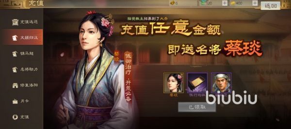 而对于首充玩家的话,建议可以考虑携带蒋钦,朱然,周仓,蔡琰,关平,通过首充能拿到蔡琰,她是一个非常好的奶妈,带她上阵的话,只需要三点防御就可以了,而且还能增加队伍的防御能力以及治疗效果,氪金玩家不可或缺的一个奶妈选择了。