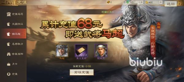 如果打算氪一个68的话,就可以带上蔡琰,马超,蒋钦,关平,周仓,在这个阵容中,之所以加上马超,是因为他的武力值非常高,一个普通的攻击就能直接对敌人造成超高伤害,还能在对战中快速击杀敌人,适合新手玩家在前期开荒,缺乏控制的情况下带上他能带来极好的效果。