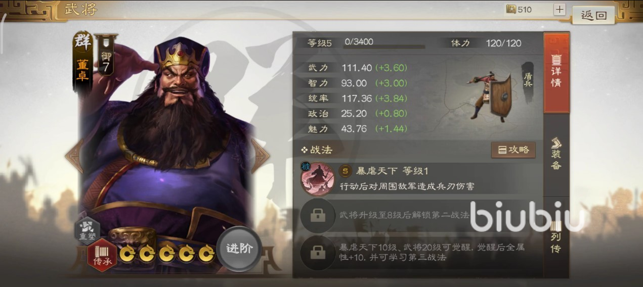 第三个推荐董卓,也是小编非常喜欢的角色,从属性和战法中就能看出策划对他偏爱。自身属于盾兵,而且统率值超高,这样就能带来一副好身板,可以去前排吸收伤害。董卓不仅仅是肉盾这样简单,而是潜藏着巨大杀伤力,通过开局之后累计暴虐状态,虽然受到伤害后会失去一层,但是每回合结束后都会补充两层,每一层暴虐都能提高对周围敌军的伤害,被动效果还不影响本回合出手。