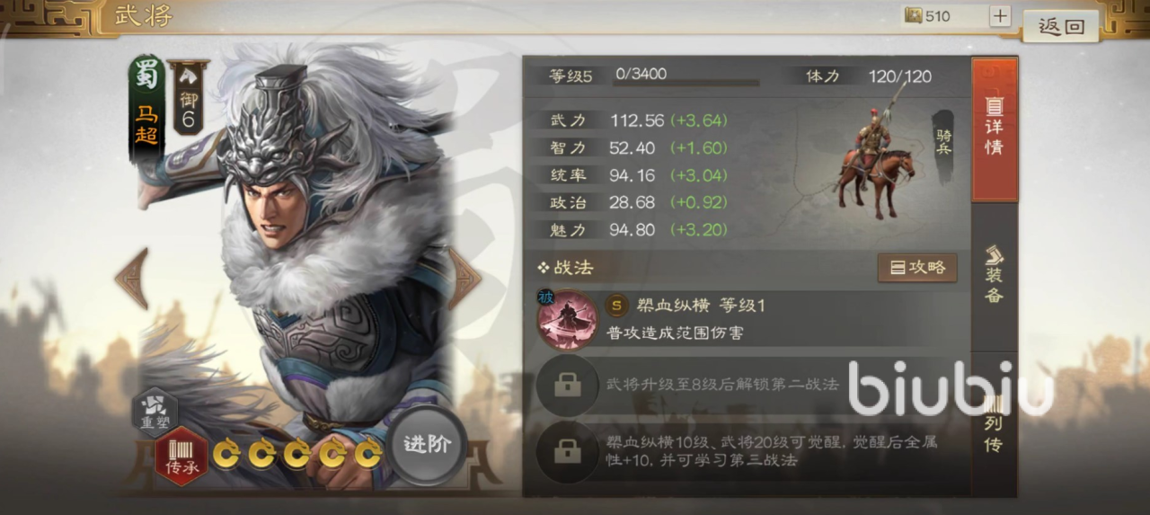 首先推荐给大家的就是目前开荒第一人马超,马超获取比较简单,只需要少量充值就能直接赠送,获取门槛很低,使得玩家开服就能拿到手。最大特点还在于自身拥有超高武力值属性,带来极强兵刃输出能力,通过自身战法效果仅仅是依靠普攻就能造成大量群体输出,在所有武将养成都不到位的情况下,马超可以快速开荒。甚至不需要橙色战法辅助,只需要搭配两个紫色就能有很好的表现。