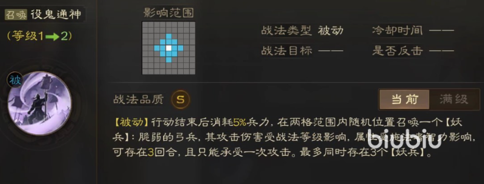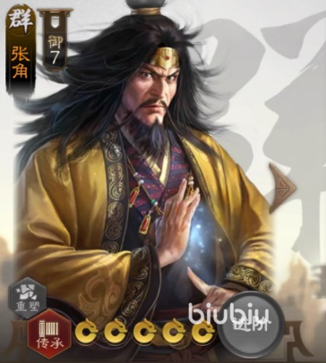 首先是自带战法,他的自带战法效果会在每回合结束后发动,发动后会消耗百分之五的兵力,之后就会在附近随机两格中召唤妖兵,这个妖兵的伤害非常高,而且会伴随智力加成的影响,最多可召唤三名妖兵上场,这个百分之五的兵力是根据当前兵力变化的,所以在大多数情况下,他可以不间断的召唤妖兵,之后是传承战法,这个战法是一个直接伤害类型的战法,发动时可以在自身两格中随机对敌方武将造成5次谋略伤害也就是智力伤害,这个效果也是非常吓人的,因为是盾兵在前排的原因,张角基本上面对的都是近距离贴脸的战斗,而这个技能可以对贴脸的敌人造成大量伤害迅速下降敌方的血量,可以辅助其他武将快速清掉敌方前排敌人。