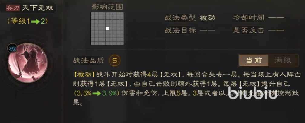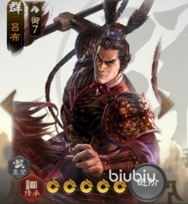吕布有两个战法,其中自带战法的效果,可以让吕布获得无双状态,在开局时就可以获得四层,这个无双状态可以提升他3.5的伤害和3.5的免伤,这里提升值的是每一层,无双状态开局四层的情况下就可以获得14.5的伤害提升和免伤度,这让吕布在开局时就有很强的正面作战能力,另外这个无双值还可以叠加吕布在战斗中只要场上有人阵亡或者自己击败就会获得无双值,三层以上还会获得免控效果,光着一个战法就能让吕布变成正面大杀器,之后是他的第二个战法,这个战法是一个纯伤害类型的战法,是专门搭配前一个战法使用的,这个战法在吕布无双满状态的时候,每次对敌人发动攻击都可以在对附近敌人造成一个这次伤害百分之89的额外伤害,无双状态下的吕布就是这个额外伤害也没什么人能吃的住,基本上每次出手都可以拿个下两个击杀,这样不仅敌方掉人快,自身的无双状态也可以一直保持在三层以上。