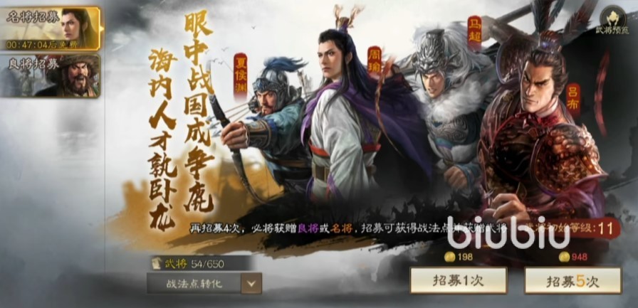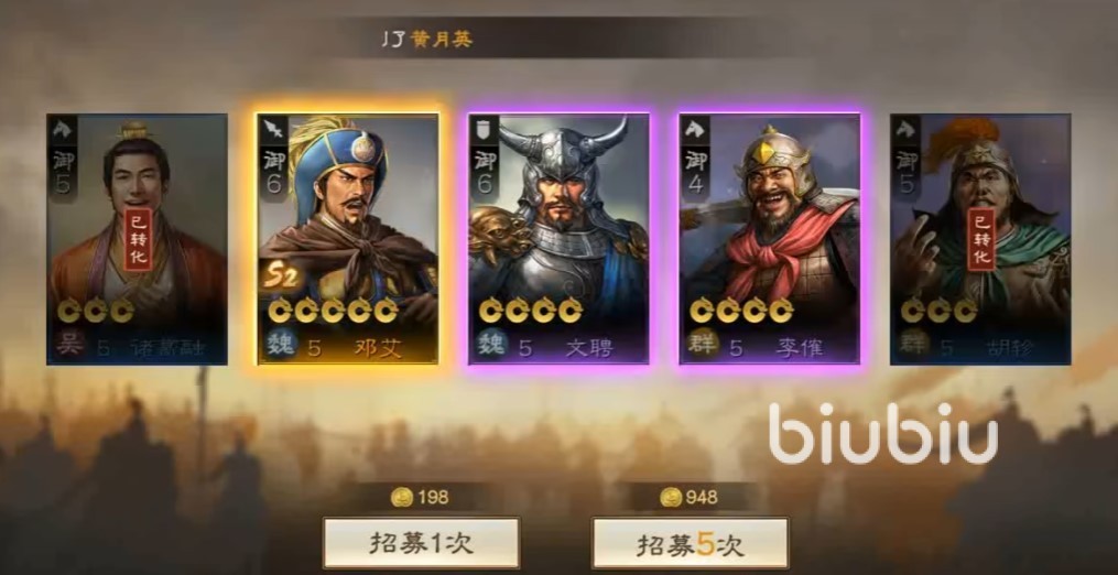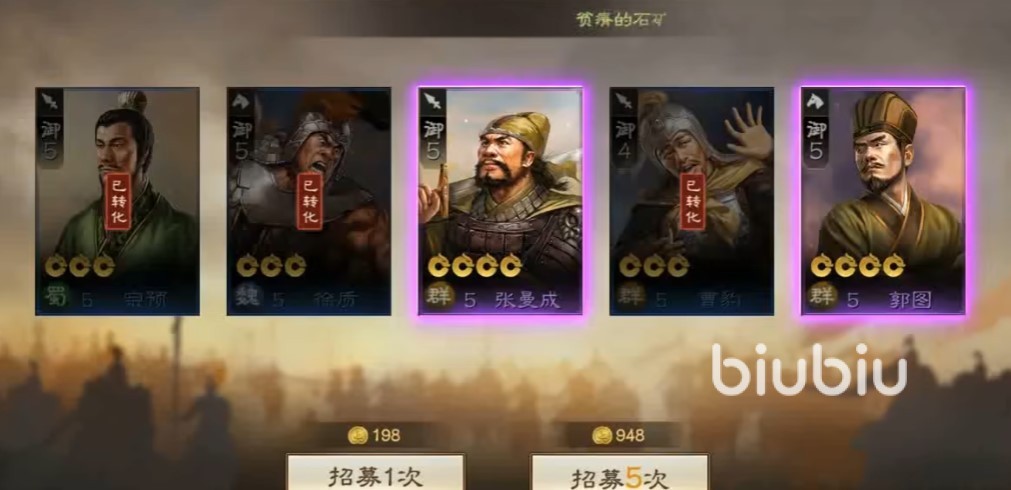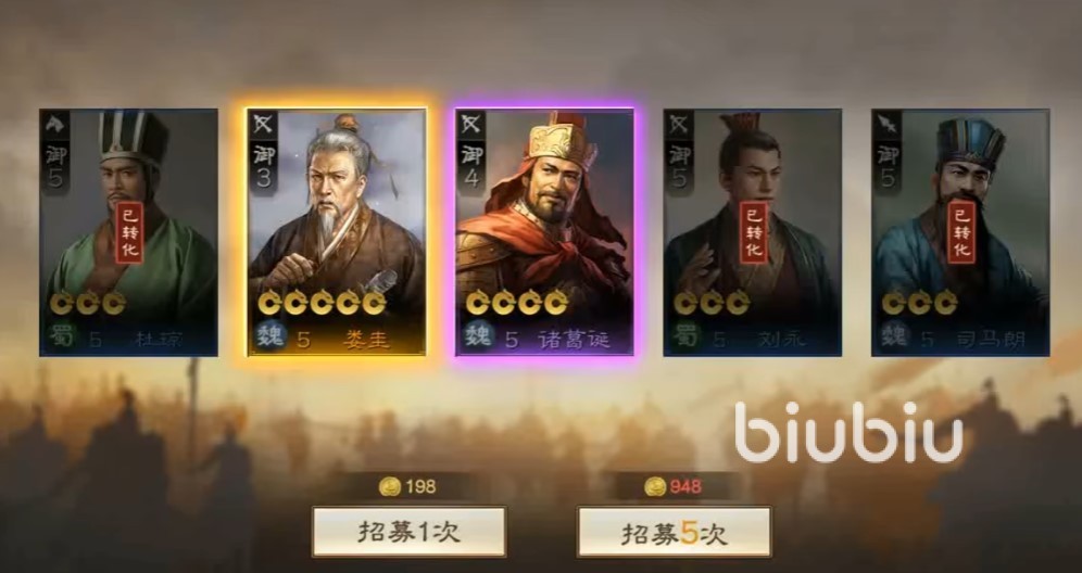 在游戏里有名将池和良将池,对应橙卡池和紫卡池,一般正式上线后还会有特定角色的概率up池,喜欢某个特定武将的话去抽对应池子会更容易出货。抽1次需要消耗198金铢或者1个招募信,5连抽则只要948金铢,从能省则省的角度来看,自然是五连更划算一些。