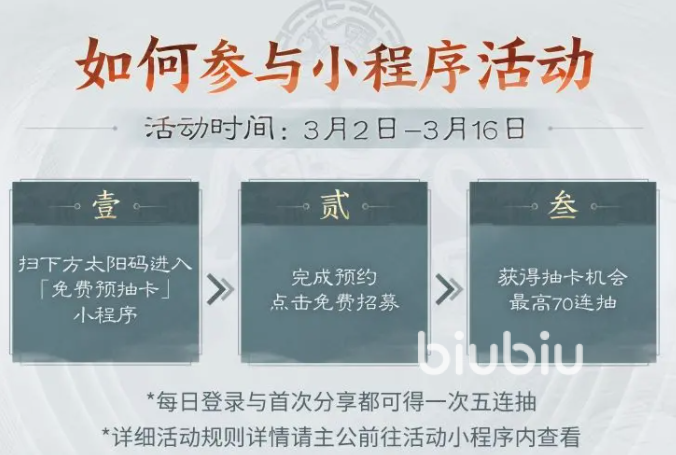 该活动的时间有限,从三月二日到十六日都可以参加,并且只要是抽到的卡牌玩家都可以选择一个橙色和四个紫色的武将带入到自己绑定的账号中来,也就意味着可以直接带上一个核心的武将出发开荒,对于武将紧缺的前期非常的有利。
