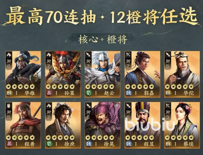 这里的武将非常的多,橙色的赵云和华雄是能力极强的角色之一,缺少辅助可以使用郭嘉和徐庶这两个顶级的角色,缺少奶妈就选华佗准没错,蔡文姬就不要选了开局只要首充就能有,这个活动选这个会巨亏的。