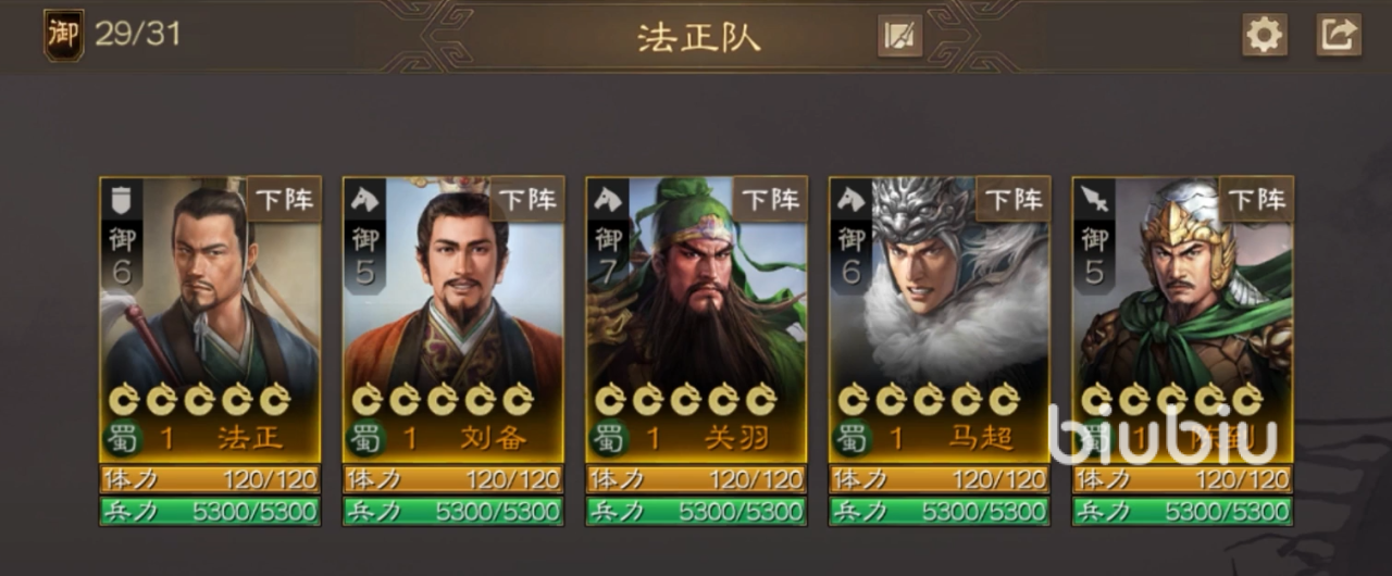 阵容搭配方面比较推荐刘备、马超、关羽和陈到,这是个不折不扣的蜀国队,能够获得阵营属性加成,法正可以带上飞鸿羽翼和倾国两个战法。倾国可以提升10%的治疗效果,而且给目标友军施加治愈的buff,在每个回合自动回复兵力,补缺飞鸿羽翼的1回合cd。而在编队站位方面,法正推荐靠后,先锋武将先手攻击之后对其进行恢复并且施加抵御效果,这样能够较大程度确保前排友军的生存。