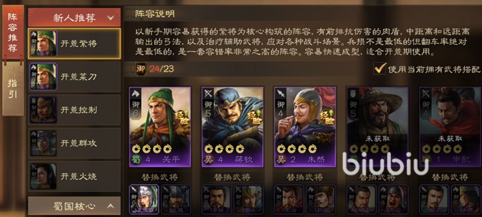 技能和阵容搭配相关:前期不要去想什么高战力,没什么多大作用。前期主要就是推剧情、重经营养成,所以这个阵容自然也是以开荒为主了。本作比较不错的就是为大家提供了一些各个阶段都能够使用的一些阵容推荐,而且质量也都很不错,分类很详细,包括菜刀队、控制队、火烧或者是群攻应有尽有。大家可以根据自己的武将储藏以及练度来选择。