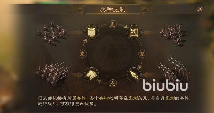 刚进入游戏的时候会有一段新手引导,主要是一些基础的操作以及战斗机制介绍,包括兵种克制等,相对而言比较容易。在指引过去之后就能够自由移动了。这个兵种克制需要重点说一下,因为是基础中的基础。包括中后期的阵容搭配、战斗过程都是基于这个机制的。本作目前一共有四个兵种,盾弓枪骑,自然也是循环单一克制的关系。即盾兵→弓兵→枪兵→盾兵。只要把握了克制关系,战斗相对而言会轻松一点,但是在绝对的实力碾压面前,克制关系也是不能螳臂当车的。